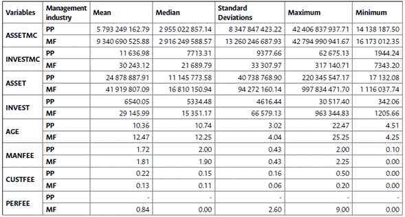 The control variables have been selected considering previous findings in the literature. Thus, we use as control variables the size of the management company, the size of the mutual fund and pension plan, the age of the pension plan and mutual fund, the fees charged by custodian and management companies and the type of management company.