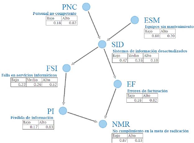 Por otro lado, hay una probabilidad del 83% de que haya una alta pérdida de información, y un 17% de poca o baja pérdida de información. Finalmente, existe una probabilidad del 87% que no se cumpla, en una baja medida, con la radicación del total de facturas generadas en un tiempo determinado, y una probabilidad del 13% de que la meta no se cumpla en un alto porcentaje.