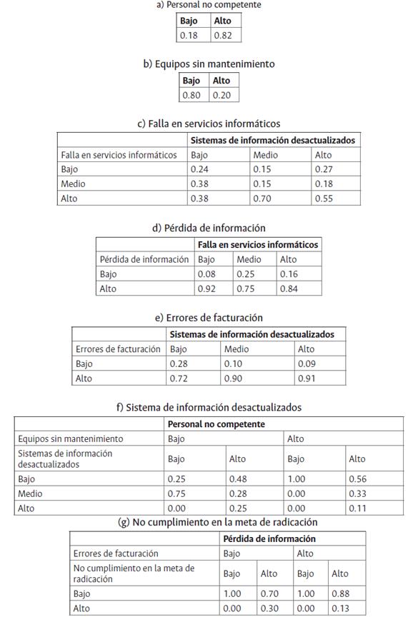 Se puede observar en la tabla 4, que existe una alta probabilidad de contratar un volumen alto de personal sin la adecuada competencia y suficiencia para el cargo al que ha sido asignado, así como una baja detección de un número alto de equipos sin mantenimiento. Cuando se cuenta con sistemas de información altamente desactualizados, existe una probabilidad del 55% de que se presenten grandes fallas en los servicios de información y del 91% de que se encuentre un alto volumen de errores en la facturación.