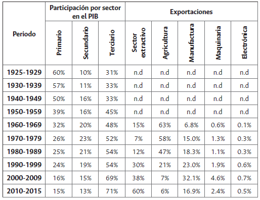 Aunque el modelo industrialista ostentó mayores tasas de inversión que el modelo aperturista, no fueron tan altas como las exhibidas por los NPIs y la participación de la manufactura en las exportaciones nunca sobrepasó el 34.5%. Sin embargo, mientras que en el periodo industrialista la agricultura y la manufactura lideraban en las exportaciones, en la apertura, el sector extractivo creció en las exportaciones totales, y la manufactura tuvo un periodo de expansión desde 1986 hasta 2007, año a partir del cual cae ostensiblemente.