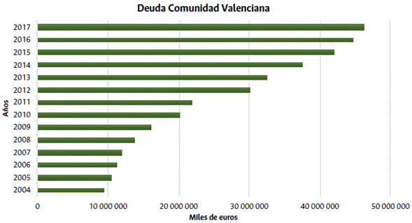 El gran salto del endeudamiento público se encuentra a partir del 2012. Ante la negativa de obtener financiación a través del mercado, el Estado puso en funcionamiento unos mecanismos de carácter extraordinario para que las comunidades pudieran hacer frente al pago de sus compromisos a corto plazo. De entre estos mecanismos, cabe destacar el papel del Fondo para la Financiación del Pago a Proveedores -FFPP-, las Líneas Instituto de Crédito Oficial -ICO-, Comunidades Autónomas para el pago de proveedores y el Fondo de Liquidez Autonómica -FLA-. En concreto, la Comunidad Valenciana recibió una liquidez por valor de 13 291.1 millones de euros en 2012 y en 2013 recibió 8235.14 millones de euros. La adhesión a estos mecanismos generó, en primera instancia, ahorros cercanos al 9% en el caso de la liquidez proporcionada a través del FFPP y del 6% para la liquidez solicitada para el FLA. Estos ahorros también han disminuido con el paso del tiempo a raíz de las medidas establecidas por la Unión Europea de reducción hasta mínimos históricos del tipo de interés de referencia. Aunque, la deuda pública no ha parado de incrementarse durante todo el periodo. Una de las principales causas ha sido la acumulación de continuos déficits presupuestarios -de media han alcanzado los -2500 millones de euros- tras la crisis financiera. Los esfuerzos por cumplir los objetivos marcados por el Estado han obligado a reducir estas cifras, y en 2017 se cerró el ejercicio con una cifra de -796 millones de euros (Conde-Ruiz et al., 2016).