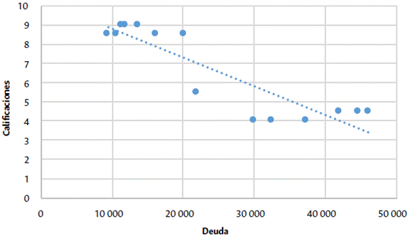 Mediante la figura anterior se puede comprobar que el modelo describe de forma satisfactoria la relación entre deuda y calificaciones puesto que todos los puntos se localizan alrededor de la recta de regresión. Además, es posible comprobar que existe una relación lineal negativa entre las variables; es decir, a medida que aumenta la cantidad de deuda pública las calificaciones obtenidas se reducen.