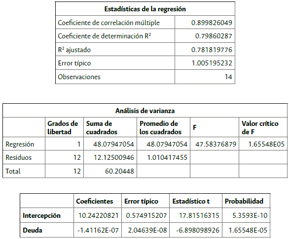 El parámetro estimado β0 -intercepción-, no tiene por sí solo una interpretación económica, simplemente representa la ordenada en el origen; P0 es el valor estimado que tomaría la calificación de un gobierno en el caso de que su nivel de deuda pública fuera igual a cero, lo cual no tendría sentido desde el punto de vista económico. El parámetro estimado P1 nos indica que, si el nivel de deuda pública se incrementa en una unidad, se estima que en promedio las calificaciones se reduzcan en 0.000000141162 unidades. Si multiplicamos por un millón, el incremento de la deuda en un millón de euros provocaría que la calificación se reduzca en 0.14 puntos.