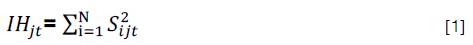Donde, IH jt representa el valor del IH para el departamento j en el año t. Este índice se construye como la suma de las participaciones -al cuadrado- de cada uno de los N sectores en la economía del departamento j en el respectivo periodo (