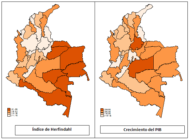 Los resultados indican que el aumento de la concentración en la actividad económica, ya sea en niveles -IH- o variaciones positivas del índice -VIH- para el periodo analizado, tiene efectos positivos sobre crecimiento económico de los departamentos. Este resultado es robusto a la inclusión de la importancia de la minería dentro de la producción departamental. El resultado apoya la hipótesis según la cual, para ciertas etapas de crecimiento, la especialización de la economía en sectores extractivos tiene como consecuencia aumentos en la tasa de crecimiento económico.
