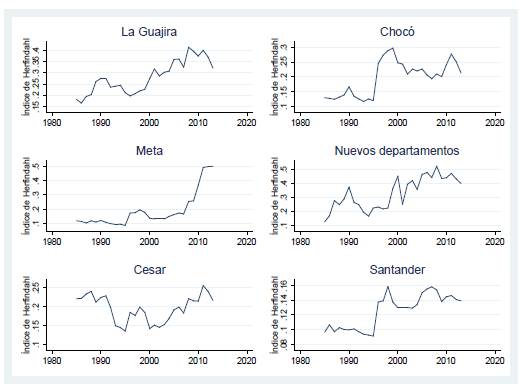 Gráfico 1: Índice de Herfindahl para algunos departamentos, 1985-2013
