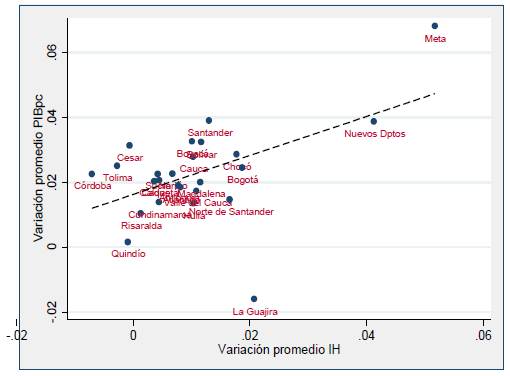 ). Mayores valores del índice indican una mayor concentración de la actividad económica. Debido a que la desagregación de los sectores de la actividad económica realizada por el DANE ha ido cambiando en el periodo de la muestra, se homogenizó toda la información realizando una agregación común para todos los periodos incluidos3. A partir de este índice se calculó su variación porcentual interanual a nivel departamental entre años consecutivos -VIH-.