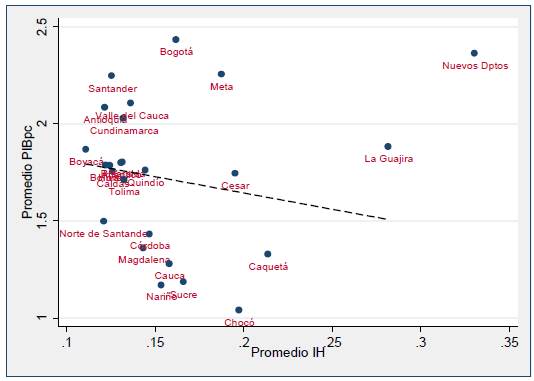 Imagen 1: Índice de Herfindahl y crecimiento del PIB, promedio por departamento, 1985-2013