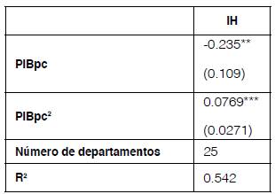 Para las estimaciones se incluyen efectos fijos de departamento y efectos fijos de año. Los resultados se muestran en el cuadro 2. De acuerdo a este análisis, existiría un umbral en el nivel de concentración en la actividad económica de los departamentos anterior al cual mayores niveles concentración tendrían efectos positivos sobre el PIB per cápita; luego de tal nivel el efecto se revierte.