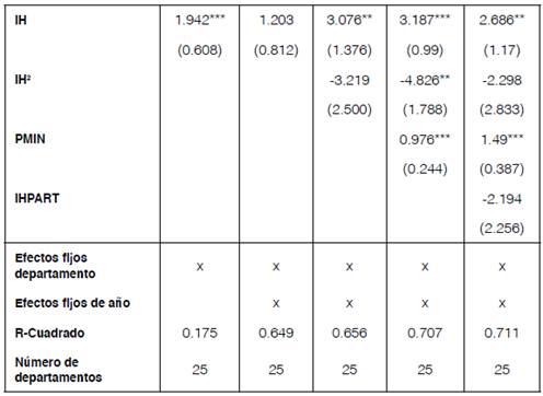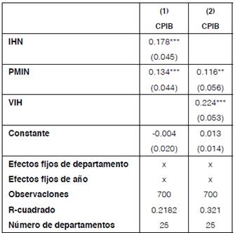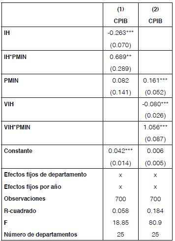 Se estimaron además cuatro modelos en los cuales la variable dependiente es CPIB. Para el caso del primer modelo, se incluyeron como variables explicativas IH y PMIN. En el segundo modelo se incluyeron como variables explicativas VIH y PMIN. Finalmente, se estimaron los dos modelos ya mencionados pero introduciendo la interacción entre las dos variables independientes. Se resalta que para los dos modelos definidos se incluyeron efectos fijos de departamento con el fin de capturar todas aquellas características idiosincráticas de los departamentos que son invariantes e inobservables en el periodo analizado. En los cuadros 3 y 4 se presentan los resultados de este análisis.