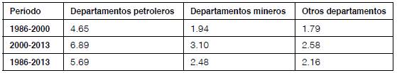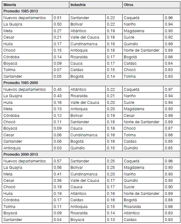 Para el caso de Colombia, como se ha referenciado a lo largo de este trabajo, uno de los principales factores que ha evidenciado la concentración de la actividad económica ha sido la participación de la actividad extractora de recursos naturales no renovables. Los resultados obtenidos hasta acá muestran que la concentración de la actividad económica en los departamentos del país durante el periodo 1985-2013 ha estado asociada con aumentos del crecimiento económico, como se evidencia en los cuadros 5 y 6, y la imagen 1, donde se muestra que el promedio el crecimiento del PIB per cápita ha estado liderado por los departamentos dedicados a la extracción de estos recursos. Sobresalen los departamentos de La Guajira, Meta, Huila, Cesar, Chocó, Córdoba, por la alta participación de la actividad minera en el PIB departamental.