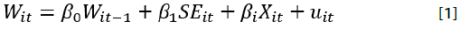 Donde W ¡t es la participación de los salarios en el PIB para cada uno de los países i en el periodo t, W it-i es el rezago la participación de los salarios en el PIB, SE it corresponde al indicador de estructura económica utilizado; para efecto de este ejercicio, se incluyó la productividad relativa del trabajo y el índice de complejidad económica, mientras X it representa a las variables de control; la participación del consumo en el PIB y la productividad total de los factores, finalmente u it es el término error.