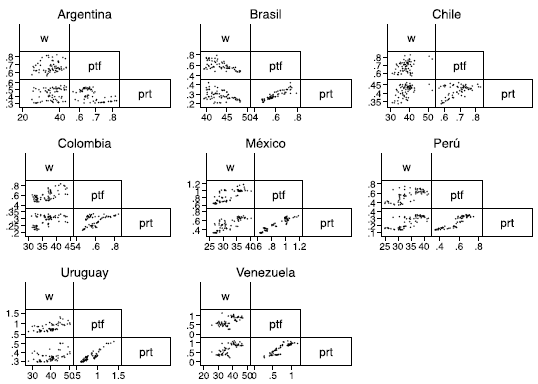 Gráfica 2: Correlaciones entre Participación de salarios (w), productividad total de los factores (PTF) y productividad relativa del trabajo (prt)