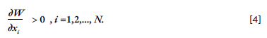 La función de la ecuación 1 también tiene que estar acorde con el principio de Pareto en el cual, si hay un incremento en el ingreso de una persona, con todas las demás variables constantes, el nivel de bienestar aumentará. Simbólicamente esto está expresado como: