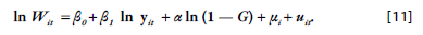 donde W it representa el nivel de bienestar social del país i en el año t medido por el IDH.y it es el ingreso medio medido por el PIB per cápita en términos reales en moneda común, β 1 es la elasticidad bienestar-ingreso, G es el coeficiente de Gini, α es la elasticidad asociada al bienestar desde el complemento del coeficiente de Gini (1 - G), β 0 es el coeficiente autónomo e independiente del ingreso y el nivel de desigualdad, p es el componente de efectos fijos individuales que captura la heterogeneidad individual (Wooldridge, 2001) existente entre los países de América latina y u it el residual de la regresión de panel datos.