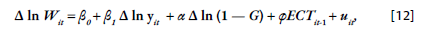 Para el análisis de cointegración entre las variables -extendido a la aplicación en panel de datos- se necesita de la generación de un modelo de corrección del error, donde primero se verifica la existencia de cointegración en la relación de largo plazo de la ecuación [11] por pruebas específicas para confirmar la cointegración de datos de panel (Kao, 1999; Pedroni, 1999) y, después de comprobarse, se plantea un modelo de corrección del error utilizando las variaciones de la relación de largo plazo -entendidas como primeras diferencias- y la información de la relación de largo plazo en un término de corrección del error, derivando en el modelo de corto plazo de la forma: