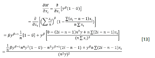 Nótese que si β < 1, la SWF deja de tener un comportamiento basado en el principio de Pareto definido en [4] y esto se explica en el teorema número 1 de Mukhopadhaya (2003a), que se encuentra desarrollado en el anexo A. La justificación es que no todos los cambios positivos en el ingreso de todos los grupos poblacionales incrementan de la misma manera el bienestar social agregado, la crítica es que el criterio del principio Pareto puede no aplicar para los percentiles poblacionales que tienen la mayor cantidad de ingresos. En este sentido, variaciones positivas del ingreso en este percentil poblacional, puede tener un efecto nulo o incluso negativo en el bienestar social agregado y, por ende, no es aplicable el principio de Pareto representado en [4]. Siempre que β < 1, la función deja de regirse por el principio mencionado; esta perspectiva es compartida por Baluch & Razi (2007), enfatizando que las variaciones positivas en los grupos poblacionales de mayores ingresos no siempre traen consigo variaciones positivas en los niveles de bienestar social agregado. Aquí es de destacarse que cuando la SWF generalizada de [7] tiene un valor de β = 1, la resultante será la formulación original de Sen (1974), expresada en la ecuación 5.
