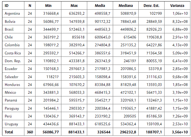 A través de esto, las relaciones de corto y largo plazo entre bienestar, ingreso y desigualdad pueden estimarse para los países de América Latina entre el periodo de 1995 y 2018. Las fuentes de información de las variables -PIB per cápita en dólares a precios constantes de 2010 y el coeficiente de Gini- para los diferentes países de América Latina fueron tomadas del Banco Mundial (s. f.) y la información del IDH fue tomada del PNUD (s. f.).