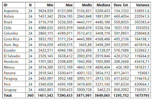 Se destaca que -para la generalidad de los países- la tendencia es creciente en los niveles de bienestar desde la SWF original de Sen. De manera puntual, Uruguay y Chile son los países que poseen los mejores niveles de bienestar, mientras que Bolivia y Honduras, son los que menor nivel poseen a lo largo del tiempo. Para el 2018, el ranking de países con mayores niveles de bienestar desde esta óptica es: 1) Uruguay, 2) Chile, 3) Panamá, 4) Argentina, 5) México, 6) Costa Rica, 7) Brasil, 8) República Dominicana, 9) Colombia, 10) Perú, 11) Paraguay, 12) Ecuador, 13) El Salvador, 14) Bolivia y 15) Honduras. Las estadísticas descriptivas del bienestar social calculado desde esta perspectiva se presentan en la tabla 1:
