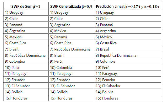 Se destaca que existen unas ligeras variaciones en los cálculos de bienestar social agregado por país en comparación con la SWF original de Sen (1974). Asimismo, existe una leve reducción de brechas con el cálculo de la SWF generalizada. El aspecto tendencial del bienestar es positivo para América Latina igual que en la versión de Sen, pero también existe un cambio el ranking de países con mayor bienestar para el año 2018. El ranking tiene el siguiente orden: 1) Uruguay, 2) Chile, 3) Argentina, 4) México, 5) Panamá, 6) Costa Rica, 7) República Dominicana, 8) Brasil, 9) Perú, 10) Colombia, 11) Paraguay, 12) Ecuador, 13) El Salvador, 14) Bolivia, 15) Honduras.