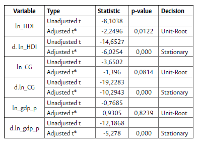Los resultados del análisis de raíces unitarias (véase anexo B) a través de las pruebas de primera y segunda generación de Levin et al. (2002) e Im et al. (2003) indican que el conjunto de variables del modelo de largo plazo poseen raíces unitarias en niveles, mientras que son estacionarias en primeras diferencias, confirmando su orden de integración requisito necesario para proseguir con el análisis de cointegración.