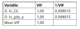 Nota: D. es el operador de primeras diferencias. Se acepta la hipótesis de que no hay problemas de multicolinealidad fuerte en el modelo dado que el valor medio del factor inflación varianza es menor que la "rule of thumb" del valor de 5. Fuente: elaboración propia.