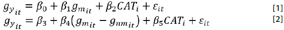 El subíndice t corresponde al año de la observación respectiva y el subíndice i representa el centro urbano o área metropolitana (AM); gy it . es la tasa de crecimiento del producto total en el año indicado; 3mi t es la tasa de crecimiento del sector manufacturero; 9nm it es la tasa de crecimiento de los otros sectores económicos; CAT i es el vector de las variables categóricas de control definidas a partir de la categorización de los municipios y departamentos usada por el Departamento Nacional de Planeación(DNP) y ε it es el vector de todos los errores aleatorios.