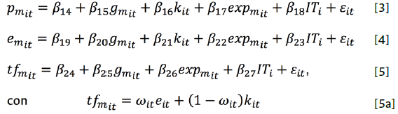 Pm it es la tasa de crecimiento de la productividad laboral de la firma manufacturera i en el año t, e mit es la tasa de crecimiento del empleo manufacturera, y g mit la tasa de crecimiento del producto industrial. IT¡ es el vector de las variables de control definidas a partir del sector por intensidad tecnológica establecido para la industria manufacturera, exp mit es tasa de crecimiento de las exportaciones manufactureras y % es el vector de todos los errores aleatorios. Además, se incluye como variable explicativa la tasa de crecimiento del capital fijo (kit); con este modelo se verifica la conjetura de la exclusión de la acumulación de capital. Mediante la incorporación de dicha variable se considera la tasa de crecimiento del stock de capital, anticipando así posibles sesgos en la apreciación de los rendimientos a escala.