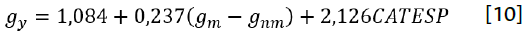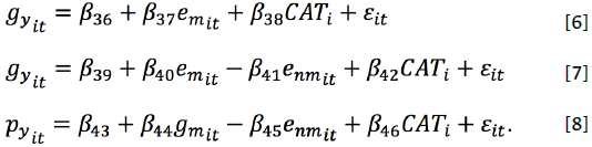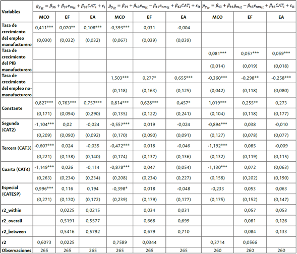 Py it es la tasa de crecimiento de la productividad total por ciudad o área metropolitana i en el año t; g mit y g nmit corresponden a las tasas de crecimiento de la manufactura y sector no-manufacturero respectivamente; e mit y e nmit con las tasas de crecimiento del empleo manufacturero y no manufacturero. CAT i . es el vector de las variables de control y ε it el vector de todos los errores aleatorios. En esta modelación el coeficiente β 37 se asocia a la participación de la manufactura en el producto total y β 40 a la participación del empleo manufacturero en el empleo total.