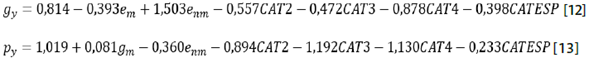 En particular, la ecuación 13 ofrece un comportamiento que llama la atención para la categoría de AM especial en su aporte a la productividad. El coeficiente -0,233 con desviaciones típicas robustas (0,175) ante una bondad de ajuste