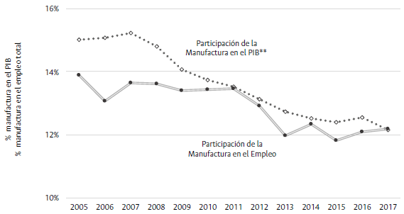 Figura 1: Participación de la industria manufacturera en empleo y producto Colombia 2005-2017 (precios constantes 2014)