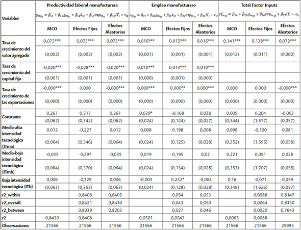 Las regresiones a partir del método MCO estiman coeficientes significativos para todos los modelos. Esta primera apreciación es consistente con las tendencias generales encontradas en la literatura empírica del campo. El análisis detallado de los coeficientes estimados muestra que no todos son susceptibles de ser interpretados en el marco de las leyes de Kaldor, y del mismo modo algunos de los coeficientes estimados por el método EF se pueden interpretar en un tratamiento práctico que sirve al análisis económico.
