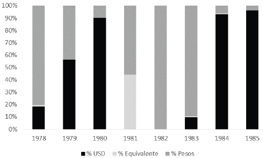 La dolarización del mercado inmobiliario tuvo una breve, pero completa retracción entre finales de 1980 y comienzos de 1983. Este proceso se dio en dos etapas, que denominamos desdolarización normativa y financiera respectivamente. La primera fue el resultado de cambios en las regulaciones que estipularon la obligatoriedad de publicitar en moneda nacional los precios de los inmuebles, mientras que la segunda derivó de las restricciones cambiarias impuestas como resultado de la crisis externa que afectó a la economía desde 1981.