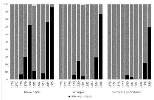 Figura 2: Inmuebles en venta en Barrio Norte, Almagro, y Barracas-Constitución (Capital Federal) en el Diario Clarín. Distribución según moneda en la cual estaban ofrecidos, 1976-1985