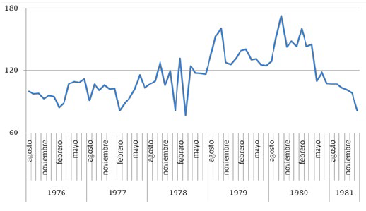 Figura 3: Índice de precios reales de los departamentos usados en la zona Norte de la Capital Federal (agosto de 1976=100)