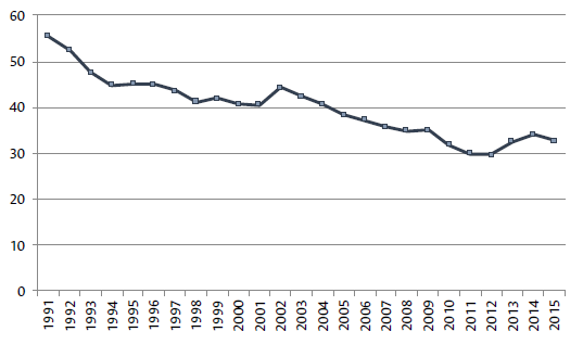 On the other hand, Figure 2 shows the evolution of the vertically integrated productivity of the Argentine tradable sector measured by its inverse: vertically integrated labor requirements per unit of output. Undoubtedly, this indicator improved throughout the period, from 55.45 jobs per million units of product in 1991 to 29.70 in 2015 (a reduction of 46%). However, if we repeat the comparison with the US, these indicators are much higher than those of developed countries. Also noteworthy is that in the 1990s, the differential of this indicator increased between both countries, since the evolution of productivity in the United States was more favorable. Thus, if in 1991 the vertically integrated labor requirements per unit of product in the tradable sector were three times greater in Argentina than in the US, by 2004 this had risen to four times Montanyà (2015, p.12). Thus, the evolution of this Argentina's competitiveness factor, while positive in absolute terms, was based on marked differences with its main developed trade partner, and the comparative evolution was therefore not favorable.