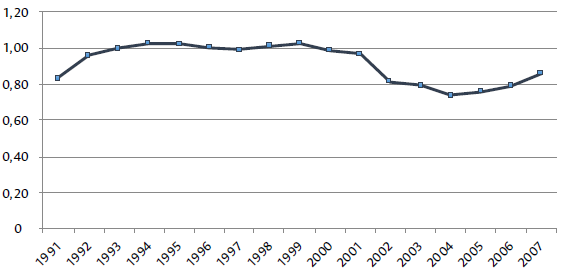 Figure 3 shows the evolution of the quotient between the CPI and the aggregate Producer Price Index in Argentina for the period 1991-2007, beyond which wholesale price data suffer the same reliability problem as the CPI. However, in this case, no alternative calculations have been made for the CPI.