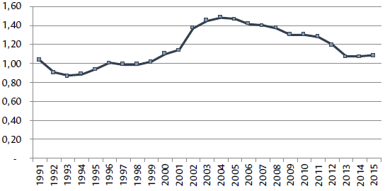 Figure 3: Tradable sector ratio between the CPI and the sectorial price index (base year: 1993) (so much per one)