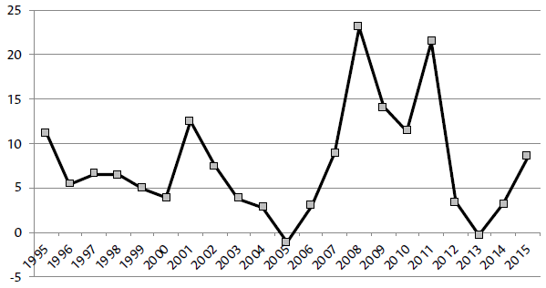 According to data from throughout the Post-convertibility period, the flow of foreign investment compensated for financing needs, mainly through the formation of assets of the non-financial sector abroad. On the other hand, the variation in the external debt was a negative effect of the debt management initiated in 2004. This was made possible due to the increase of the internal debt. If we take the effects of exchange into account, the domestic debt has increased by $91.4 billion since 2005, while total public debt between 2005 and 2015 grew by $94.1 billion - very similar figures.28 In this sense the accumulation of reserves has been fundamental, since the main internal financier for the Treasury has been the Central Bank. The evidence of this is the reduction in reserves between the periods 2002-2009 and 2012-2015 (Table 1).