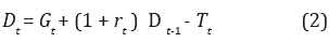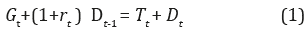 Donde, Gt representa el gasto público sin intereses o gasto primario, D t -1 es el saldo de deuda acumulada en el periodo anterior sobre la cual se paga una tasa de interés r t T t representa los ingresos tributarios y D t corresponde a la deuda emitida para financiar el déficit fiscal en t, por ejemplo, mediante bonos soberanos. Así, las necesidades de financiamiento que son cubiertas con nuevas emisiones de deuda pueden estar determinadas por la diferencia entre los ingresos y el gasto total del gobierno: