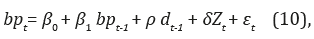 donde µ t = δZ t + ε t y εt es el término de error con media cero. Bajo esta especificación lineal, Bohn (1998, 2007) muestra que una relación estable y estrictamente positiva entre bp t y dt, es decir, si ρ > 0, es consistente con las condiciones definidas en las ecuaciones 7 y 8. Entonces, se puede adoptar como una condición suficiente de sostenibilidad fiscal. La intuición detrás de este razonamiento es que la relación deuda/PIB puede revertir a un valor promedio si las autoridades de política toman medidas correctivas frente a los incrementos de la relación deuda/PIB. En términos formales, esta proposición muestra que la deuda se reduce en una proporción [1 - ρ]n, ya que E t [ d t+n ] ≈ [ 1 - ρ ]n x d t → 0 para cualquier ρ > 0. En otras palabras, asegura trayectorias de deuda pública dinámicamente estables.