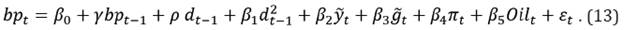 donde r*, es la tasa de interés libre de riesgo3, la cual junto con se asumen constantes. Para la formulación la FRF en este trabajo aplicado para Colombia, la ecuación 11 se ajusta para incorporar las variables de control: brecha del producto [ỹ t ] como indicador del ciclo económico, brecha de los gastos del gobierno [g̃ t ], como sugiere Bohn (1998, 2007). Además, se incorpora la inflación [ ϖ t ], así como variaciones en los precios del petróleo [ Oil t ]4, como muestra la ecuación 13.