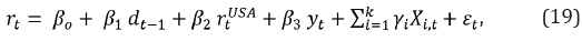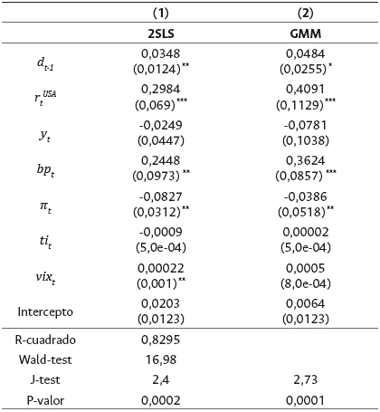 Para la estimación del ISF de Mackiewicz-Łyziak y Łyziak (2019), primero se estima la respuesta de la tasa de interés de la deuda frente a los cambios en la relación deuda/PIB [dt-1], la tasa de interés de Estados Unidos [rt USA] y la tasa de crecimiento (real) de la economía [ y t ], como muestra la ecuación 19.