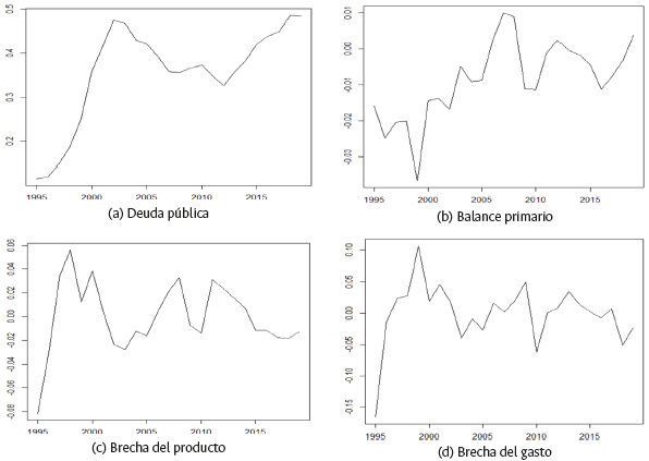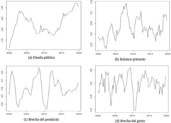 La selección de las variables se hace de forma similar a la realizada en los trabajos de Bohn (1998, 2008), Celasun et al. (2006), Mendoza y Ostry (2008), entre otros. Por otra parte, la brecha del producto [ ỹ t ] se calcula tomando la diferencia logarítmica del PIB -desestacionalizado y ajustado por efectos calendario- y la tendencia obtenida mediante el filtro de Hodrick-Prescott con parámetros A = 1600 (serie trimestral) y A = 100 (serie anual10 . De manera similar, la brecha del gasto público [g t ] se calcula tomando la diferencia de la serie desestacionalizada del gasto público (sin intereses) y su tendencia obtenida mediante el filtro de Hodrick-Prescott.