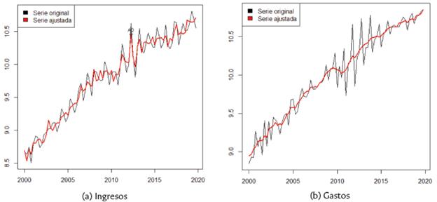 Además, como las variables fiscales están sujetas a una fuerte estacionalidad, los datos se han ajustado al eliminar el componente estacional de todas las series por medio de la metodología X12-ARIMA11, la cual ayuda a corregir en gran medida el problema. La figura 3 presenta las series originales y desestacionalizadas utilizadas en el modelo.