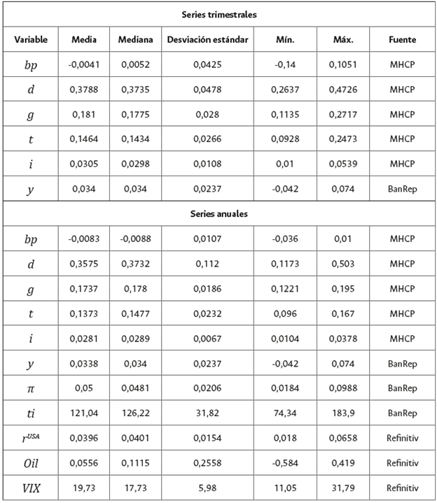 El presente artículo utiliza series trimestrales del PIB -base 2015- desestacionalizado y ajustado por efectos calendario. Las variables fiscales incluidas corresponden a los periodos 1994 a 2019, usando datos anuales y 2000-Q1 a 2019-Q4, usando datos trimestrales del Ministerio de Hacienda y Crédito Público (MHCP) y el Banco de la República (BanRep). Las variables fiscales corresponden a las cuentas del gobierno nacional central (GNC)8 de Colombia para las series de gastos sin pago de intereses [ G ], ingresos [ T ], deuda pública [ d ], balance primario [ bp ], pago de intereses [ i ], tanto en niveles como las razones de estas respecto al PIB9. Adicionalmente, se incorporan al análisis las series anuales de tasas de interés (cero cupón) a 10 años de Estados Unidos [ r USA ] como referencia de la tasa libre de riesgo, las tasas de interés de política monetaria de Colombia y Estados Unidos, la inflación [ ϖ ], los precios del petróleo de referencia Brent [ oil ], el índice de volatilidad del mercado financiero (VIX) y los términos de intercambio [ ti ]. La serie de términos de intercambio se toma del Banco de la República y las demás series de datos se obtuvieron de Refinitiv (Thomson Reuters) con periodicidad mensual y se transforman en datos trimestrales y anuales tomando promedios para cada periodo. La tabla 1 presenta las estadísticas descriptivas de los datos utilizados.