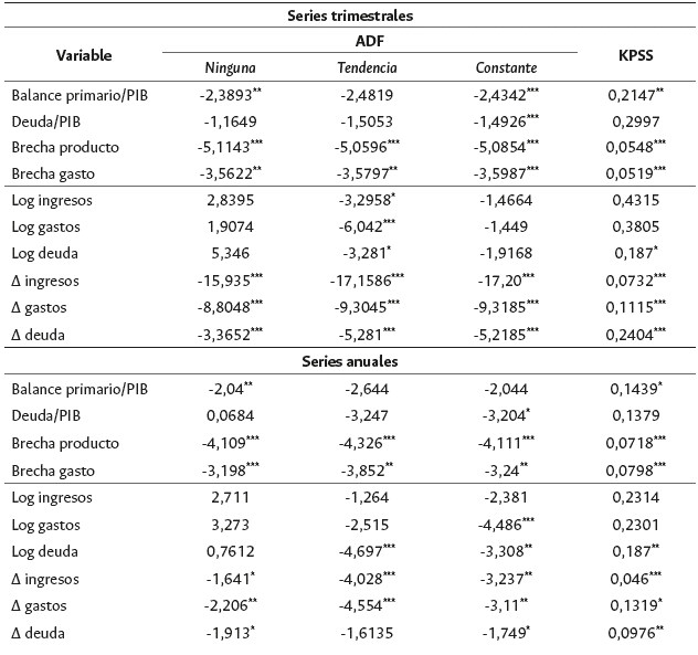 Los resultados de todas las pruebas sugieren que la razón deuda/PIB en Colombia es no estacionaria, ya que no se puede rechazar la hipótesis de raíz unitaria con las pruebas ADF y KPSS, mientras que para la razón balance primario/PIB, sí hay evidencia estadística de estacionariedad con ambas pruebas. También se encuentra evidencia estadística de estacionariedad para las variables brecha del producto y del gasto en el periodo de análisis. Asimismo, todas las pruebas sugieren la presencia de no estacionariedad en las variables de ingresos y gastos en niveles. Sin embargo, las series diferenciadas -primera diferencia logarítmica- no presentan raíz unitaria, por lo que se puede concluir que están integradas de orden uno-l(1)-