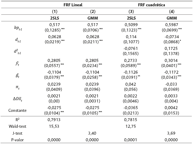 La estimación de la FRF -lineal y cuadrática- se realiza siguiendo los trabajos de Bohn (1998, 2007, 2008), Mendoza y Ostry (2008) y Mackiewicz-Łyziak y Łyziak (2019). Para ello, se toman las series de datos anuales y se utilizan el método de mínimos cuadrados en dos etapas (2SLS) y el método generalizado de momentos (GMM). Estos métodos se emplean para controlar la endogeneidad de la brecha del producto, la cual puede afectar las variables fiscales como, sugieren Eller y Urvová (2012), entre otros. Para ello, se toman como instrumentos los rezagos de las variables y, así como del conjunto de variables de control. La validez de los instrumentos se evalúa usando la prueba de Sargan -Prueba J- de sobreidentificación de restricciones y la prueba F sobre la significancia conjunta de los instrumentos12. La tabla 3 resume los resultados de las estimaciones usando los métodos 2SLS y GMM.