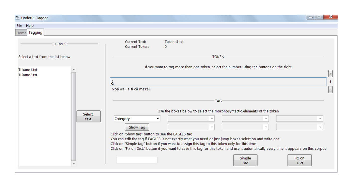 A través de una interfaz basada en ventanas, menús y controles sencillos, UnderRL Tagger (Pemberty Tamayo et al., 2020) permite realizar un proceso de etiquetado manual asistido y automatizado, lo que posibilita a los investigadores en descripción gramatical y léxica acogerse a estándares internacionales de la lingüística de corpus, elegir un sistema de etiquetas propio e incluso realizar etiquetados por fuera del POS con cualquier otro fenómeno que se desee. De la misma manera, permite el manejo de archivos de diccionario que pueden servir en un futuro para seguir etiquetando textos en la misma lengua o compartirlos con otros investigadores.