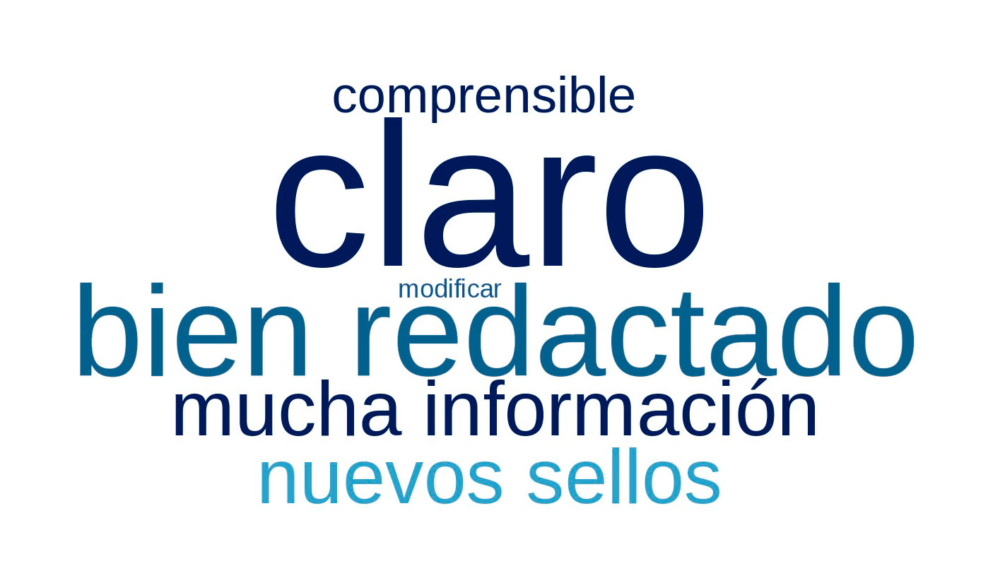 De todos modos, la valoración general del cuestionario fue positiva, ya que los sujetos parecen estar de acuerdo con el contenido y la estructura del instrumento. Según los comentarios anteriores, el instrumento validado cumplió con la máxima de cantidad porque no da más ni menos información de la necesaria. Todos los participantes fueron capaces de parafrasear correctamente las preguntas del cuestionario y no reportaron dificultades con el recuerdo de la información nutricional de la etiqueta. También se cumplió con la máxima de claridad, puesto que el contenido del instrumento no es ambiguo. De hecho, como se puede ver en la nube de palabras (Figura 3), los participantes emplearon con mayor recurrencia en sus respuestas términos que se asociaban con la claridad del instrumento.